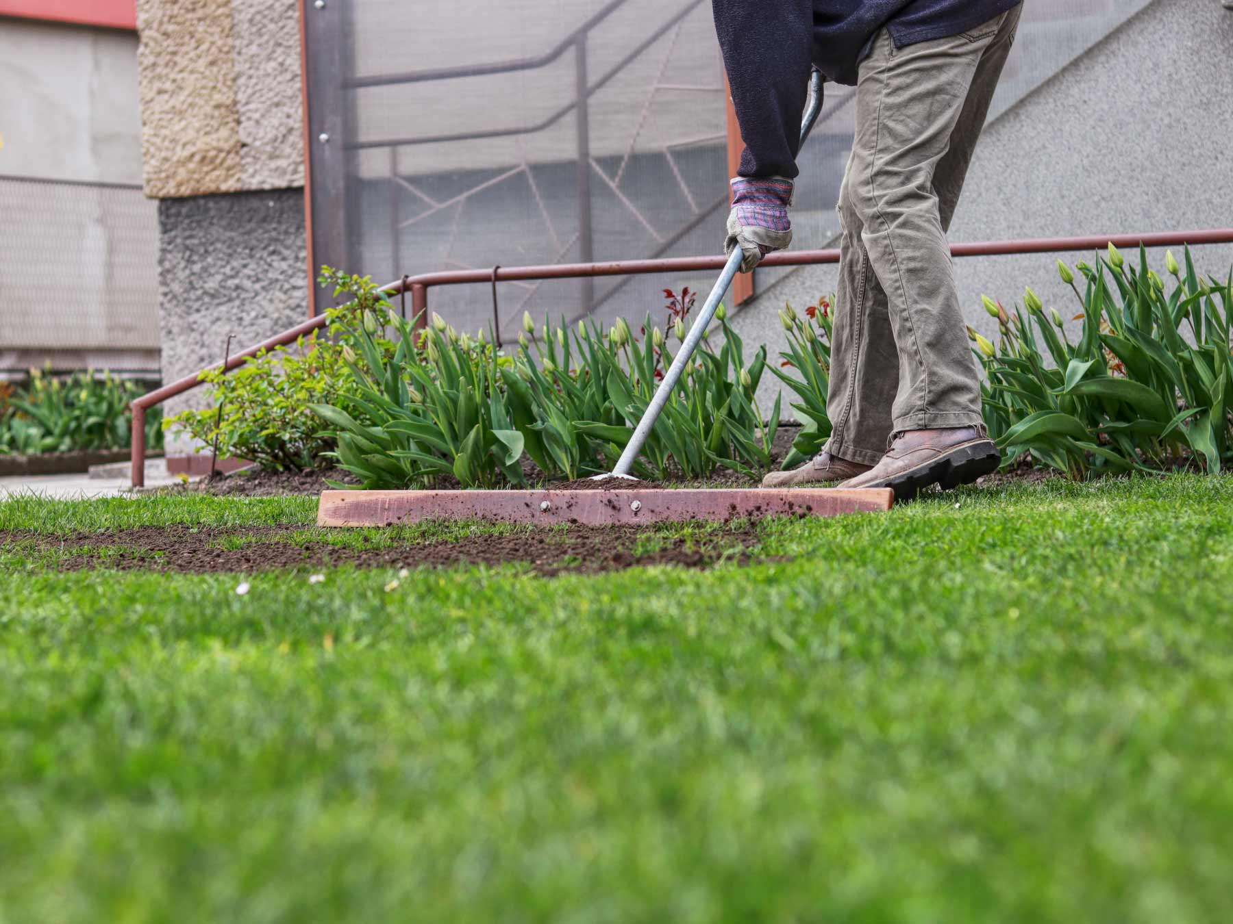 Material application. The sand-compost blend or fill material appropriate for the specific depth of correction is applied to the identified low spots and irregular areas. For shallow corrections (less than half an inch of fill needed), material is spread across the affected area and worked into the turf surface with a lawn leveling drag — a flat, flexible implement that distributes the material evenly across the turf without burying the grass blades.